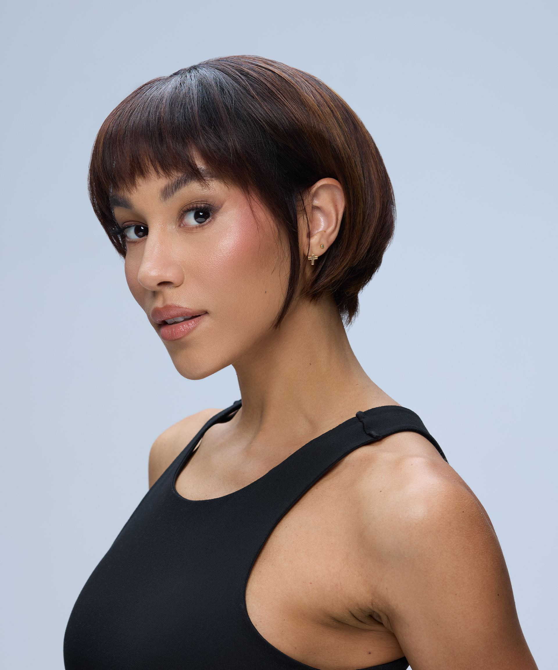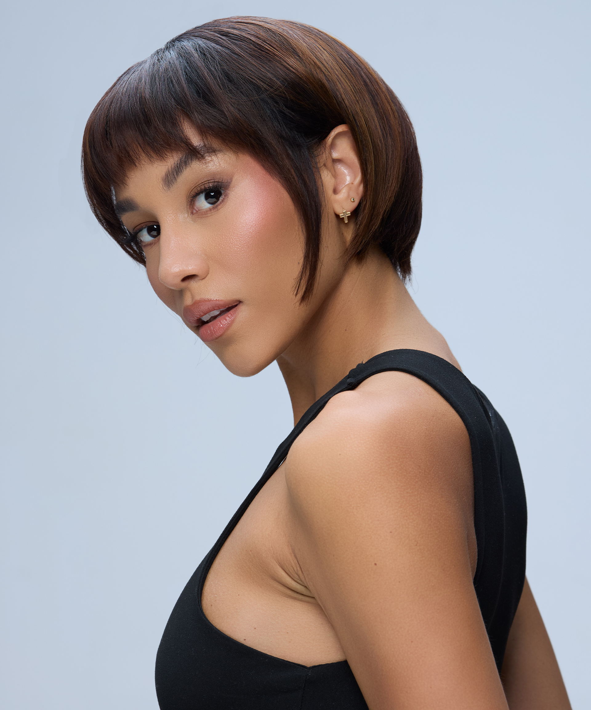 The Le Marais Brunette Wig embodies modern Parisian sophistication. This sleek short bob with soft bangs frames the face beautifully, creating a refined yet effortless look. Crafted from premium human hair with an ultra-natural HD lace construction, it offers movement, shine, and a flawless hairline — perfect for women who appreciate understated luxury.